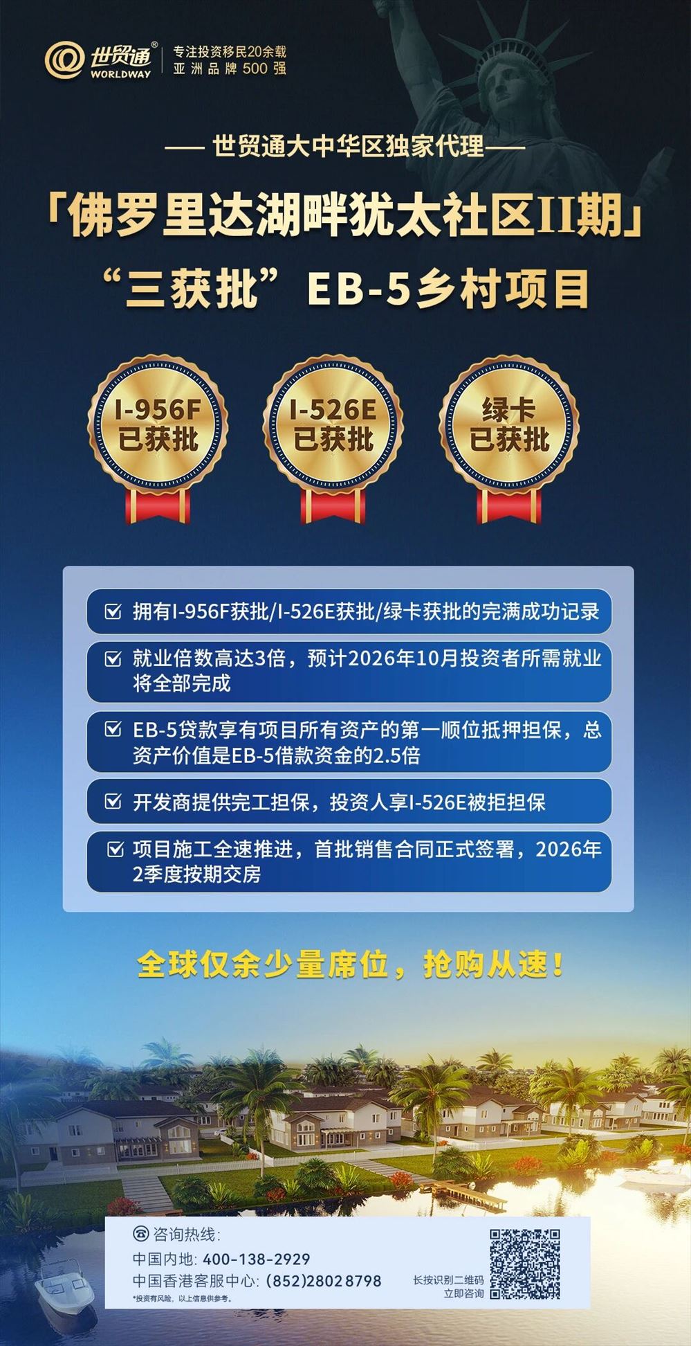 目前正是投资人通过EB-5实现美国移民规划的黄金窗口期。由世贸通担任大中华区独家代理的I-956F均已获批的两大项目:「大烟山・万豪酒店」EB-5乡村项目和「佛罗里达湖畔犹太社区Ⅱ期」EB-5乡村项目,正进一步助力投资者稳妥、无排期、高效地实现美国身份规划,快速踏上美国新生活之路。