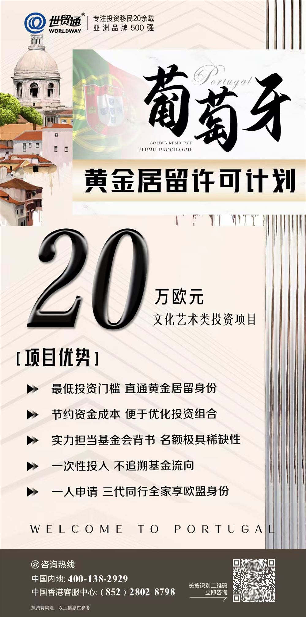 如需了解更多葡萄牙移民详情,详询中国内地:400-138-2929,中国香港客服中心:(852)2802 8798