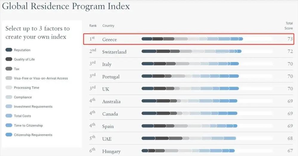 2025年,Henley & Partners发布的《2025年全球居留计划指数》在全球移民领域引起了广泛关注。在这份权威的榜单中,希腊黄金签证计划以73分(满分100分)的高分跃居榜首。这份榜单把全球26个投资移民项目放在同一把尺子上量:国家信誉、医疗效率、护照能去的国家数、审批时长、合规透明度、退出机制、投资保值潜力等10个维度,都精准击中了高净值家庭在身份规划与资产配置中的核心需求。