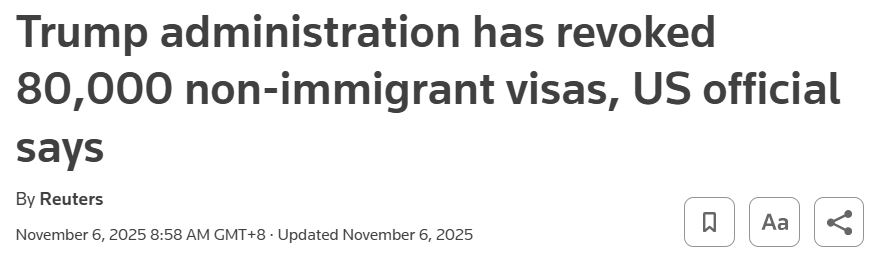 近日,美国国务院一名高级官员透露,自特朗普就任以来,美国已吊销约 8万份非移民签证,涉及包括学生签证(F类)、工作签证(H类)在内的多种临时身份。8万签证被撤:政策收紧信号明确被吊销的原因,从以往常见的酒驾、盗窃、袭击等行为,延伸至社交媒体言论与政治倾向等…