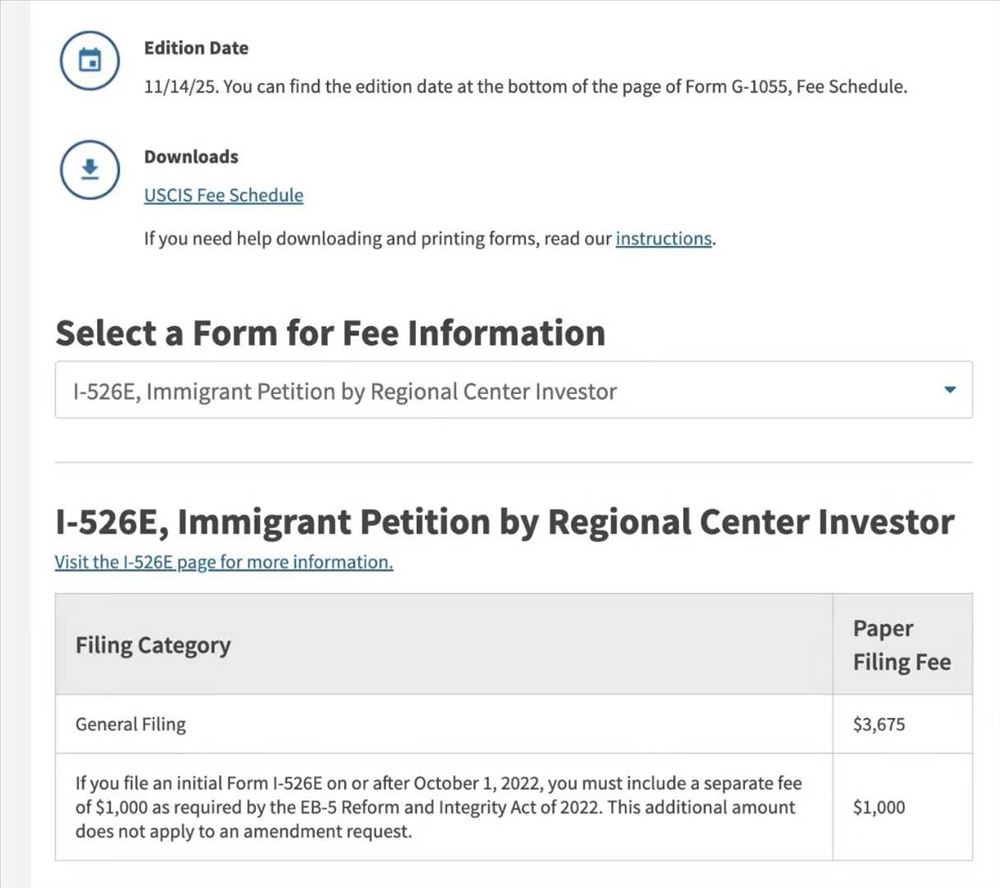 自2025年11月14日起,美国移民局(USCIS)已经正式把EB-5投资移民相关的申请费用,全部恢复到2024年4月1日之前的旧收费标准。简单说:现在递交EB-5,可以按“便宜很多”的旧费用办理。移民局官网已更新费用表,旧费用已被确认合法有效。