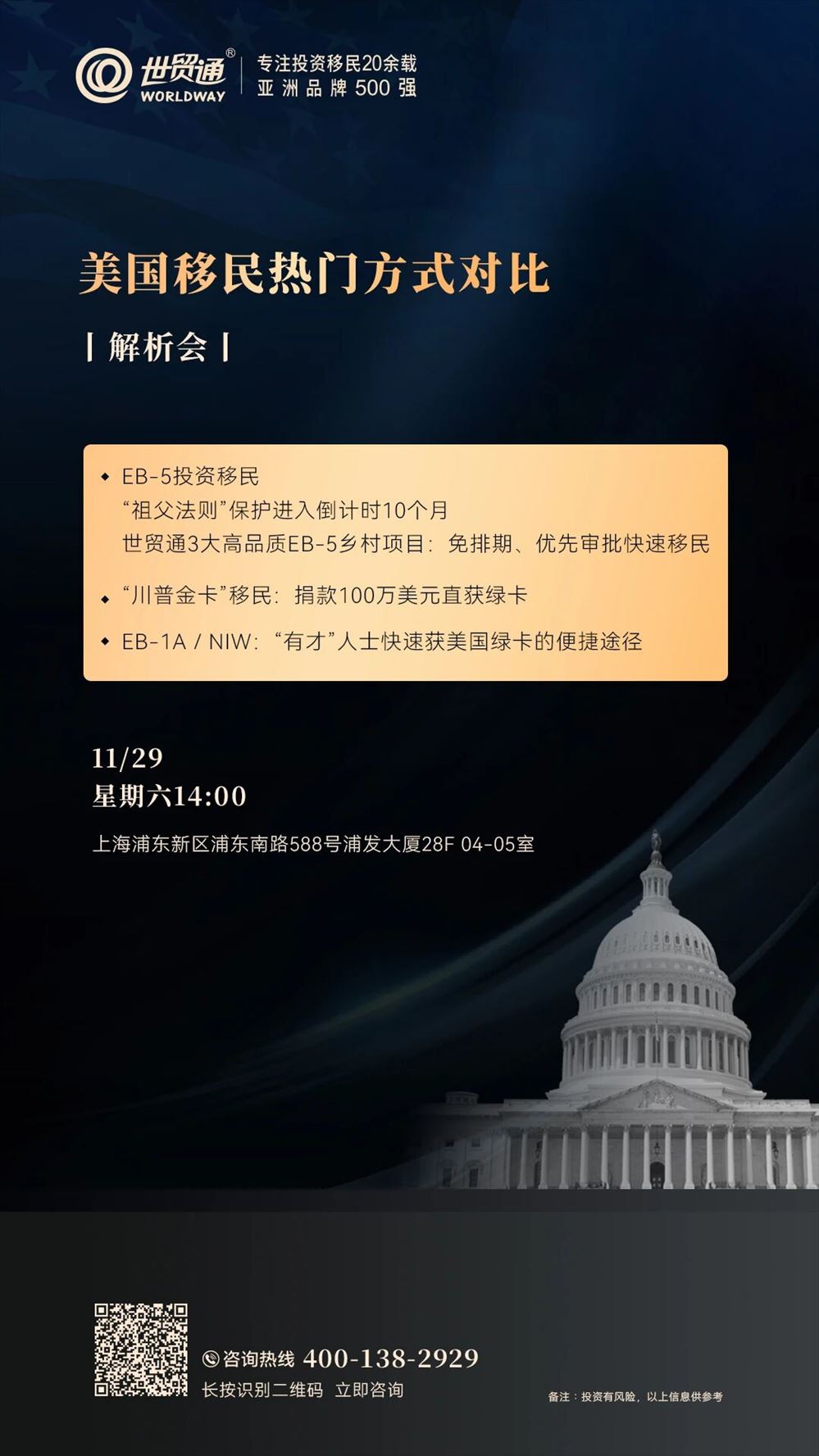 美国移民热门方式对比解析会2025年11月1日• 世贸通移民• 970 阅读 美国移民热门方式对比解析会 详询咨询 中国内地: 400-138-2929中国香港客服中心: (852)2802-8798 投资有风险,以上信息供参考 上一篇别花冤枉钱!抢抓EB-5低价窗口下一篇高净值人群为什么需要第二本护照