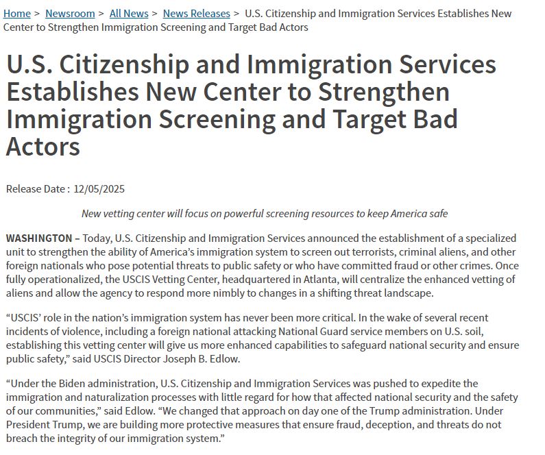 当地时间2025年12月5日,美国移民局(USCIS)发布声明宣布,将成立一个新的审查中心,加强对外国公民移民申请的背景审查。