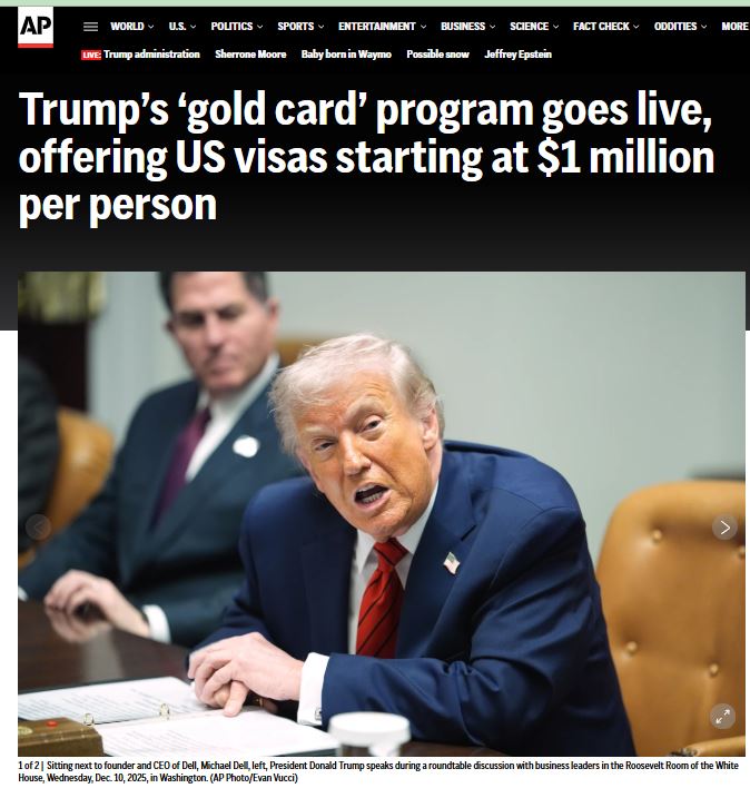 当地时间2025年12月10日,美国总统特朗普宣布,美国政府当天起正式接受“川普金卡”移民项目的申请。