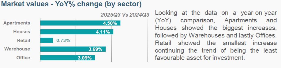 同时,住宅类房产价格同比去年也有显著上涨。其中,公寓(Apartments)同比涨幅 4.50%,别墅(Houses)同比涨幅 4.11%。