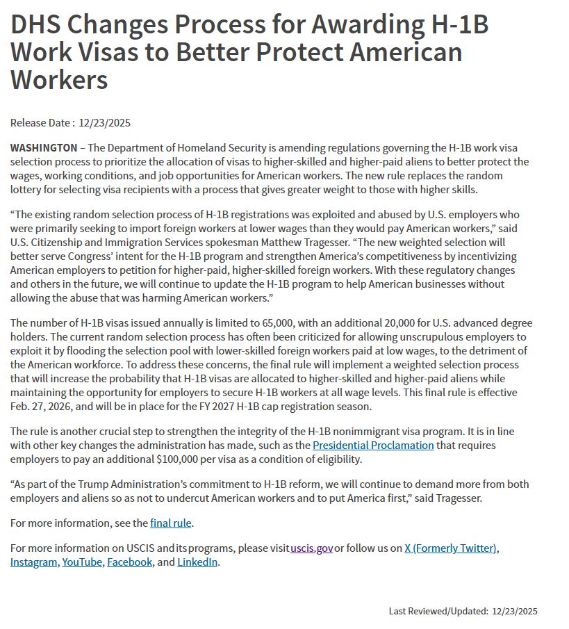 2025年12月23日,美国国土安全部(DHS)与美国移民局(USCIS)正式确认:H-1B签证将从沿用多年的随机抽签制,调整为按工资等级加权抽签的新机制。