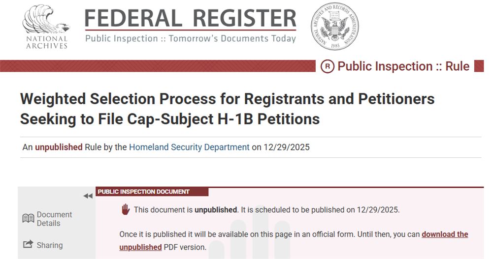 根据官方公告,新规将于2025年12月29 日正式刊登于联邦公报,并在60天后,即 2026年2月27日生效。这意味着,2027财年(预计于2026年3月启动)的H-1B申请季,将全面适用工资加权抽签规则。