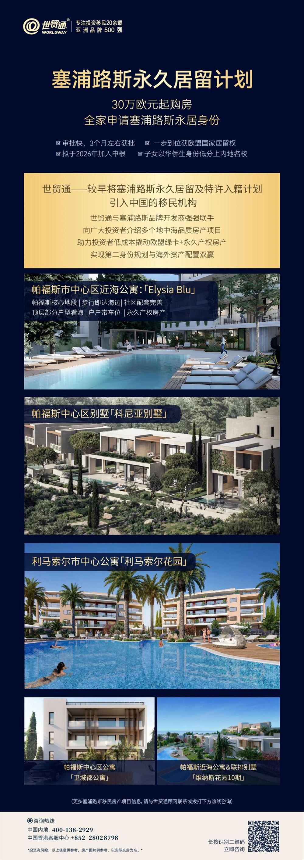 在现行政策框架下,投资者仅需30万欧元起购房,即可实现全家获得塞浦路斯永久居留身份。真正优质的身份与资产机会,从不等人,提前完成规划,往往意味着更多选择空间。