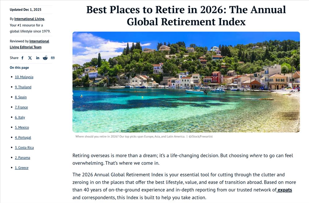 近日,全球知名权威生活方式杂志《国际生活》 (International Living)重磅发布2026 年度《全球退休指数》。这份报告评估体系涵盖生活成本、医疗水平、住房条件、气候环境、签证与居留便利性,以及外国人融入难易程度等多个关键维度。