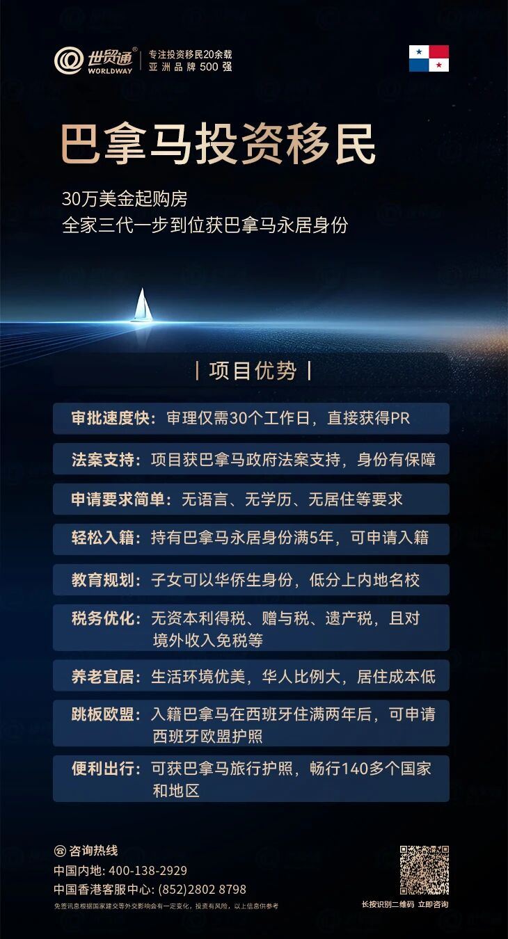 世贸通集团,亚洲品牌500强,专注投资移民20余载,是您办理巴拿马移民的放心之选。建议有意向的家庭立即行动,尽早启动申请。世贸通与巴拿马品牌开发商强强联手,隆重向广大投资者精选巴拿马城高品质房产项目,助力投资者实现海外身份规划与海外资产配置的双赢。